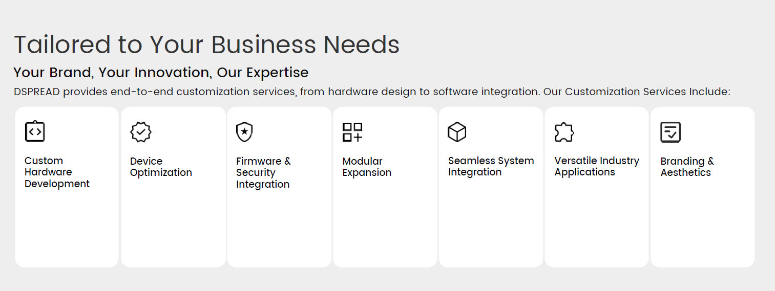 At DSPREAD, our OEM/ODM services are built around versatile industry applications, offering 7-dimensional end-to-end customization to tailor payment hardware to your exact business workflows. Our customization scope covers: