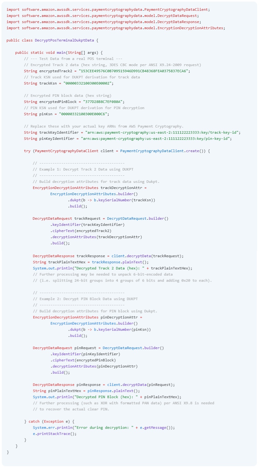 This sample provides a starting point for integrating AWS Payment Cryptography into your Java application to decrypt POS terminal data securely. For full details on the API parameters and supported algorithms, refer to the AWS Payment Cryptography Data Plane API Reference.